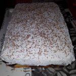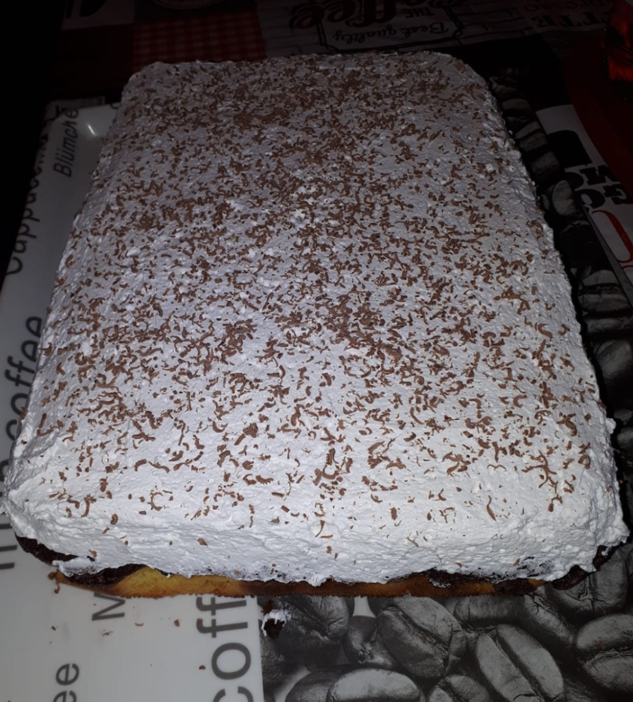 • Fertigstellung: Nach dem Backen den Kuchen abkühlen lassen. Dann 2,5 dl Sahne schlagen und gleichmäßig auf der Creme verteilen. Zum Schluss mit Schokoladenraspeln garnieren.