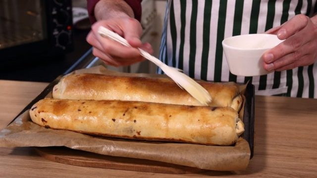 - Aufrollen: Den Teig fest aufrollen. Die Strudel auf ein mit Backpapier ausgelegtes Backblech legen und mit verquirltem Ei bestreichen.