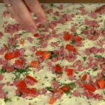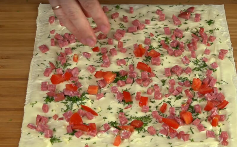 - Auf das erste Brotstück streichen wir Schmelzkäse, bestreuen es mit geschnittenem Aufschnitt, Tomate, etwas Dill und Knoblauch. Das Ganze decken wir mit dem zweiten Brotstück ab.