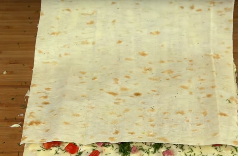 - Wir bereiten das Lavash-Brot vor und schneiden es in 3 gleiche Quadrate.
