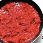 • In Schmalz dünsten wir die vorgekochte, in Würfel geschnittene Rote Bete an und geben nach und nach das Tomatenmark dazu und würzen mit Essig, gegebenenfalls auch mit Zucker.