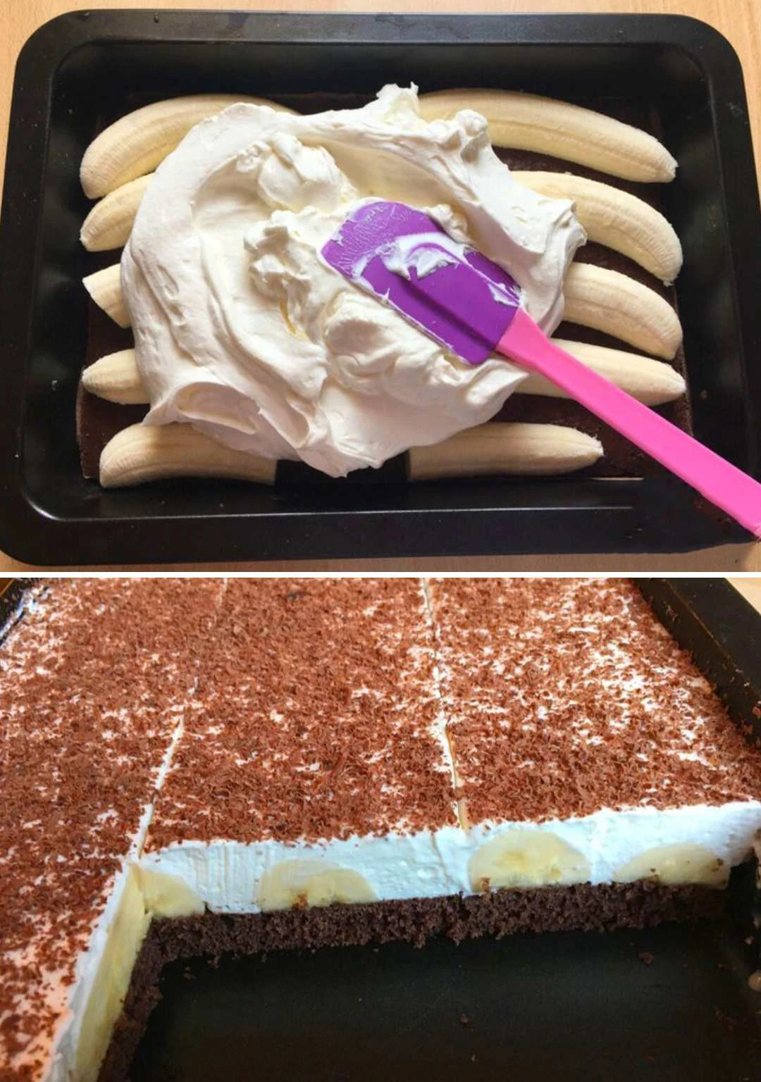 • Anrichten des Desserts: Den ausgekühlten Boden auf eine Platte legen. Die Bananen längs halbieren und gleichmäßig auf dem Boden verteilen. Die Mascarpone-Creme darauf schichten und gut glatt streichen. Die Oberfläche mit geraspelter Schokolade bestreuen und ggf. mit Bananenscheiben garnieren. Den Kuchen mindestens 2 Stunden im Kühlschrank kühlen lassen.