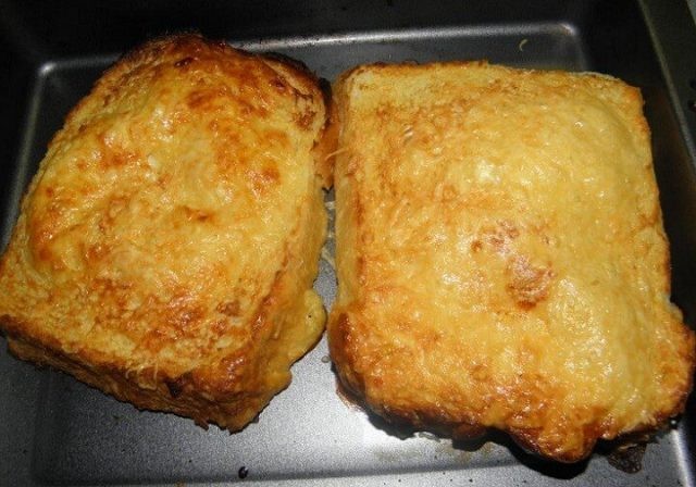 - Auf die Scheiben legen wir Schinken und Käse und bedecken sie mit der zweiten in der Masse gewandeten Brotscheibe. Wir gießen die restliche Mischung darüber und bestreuen mit Käse.