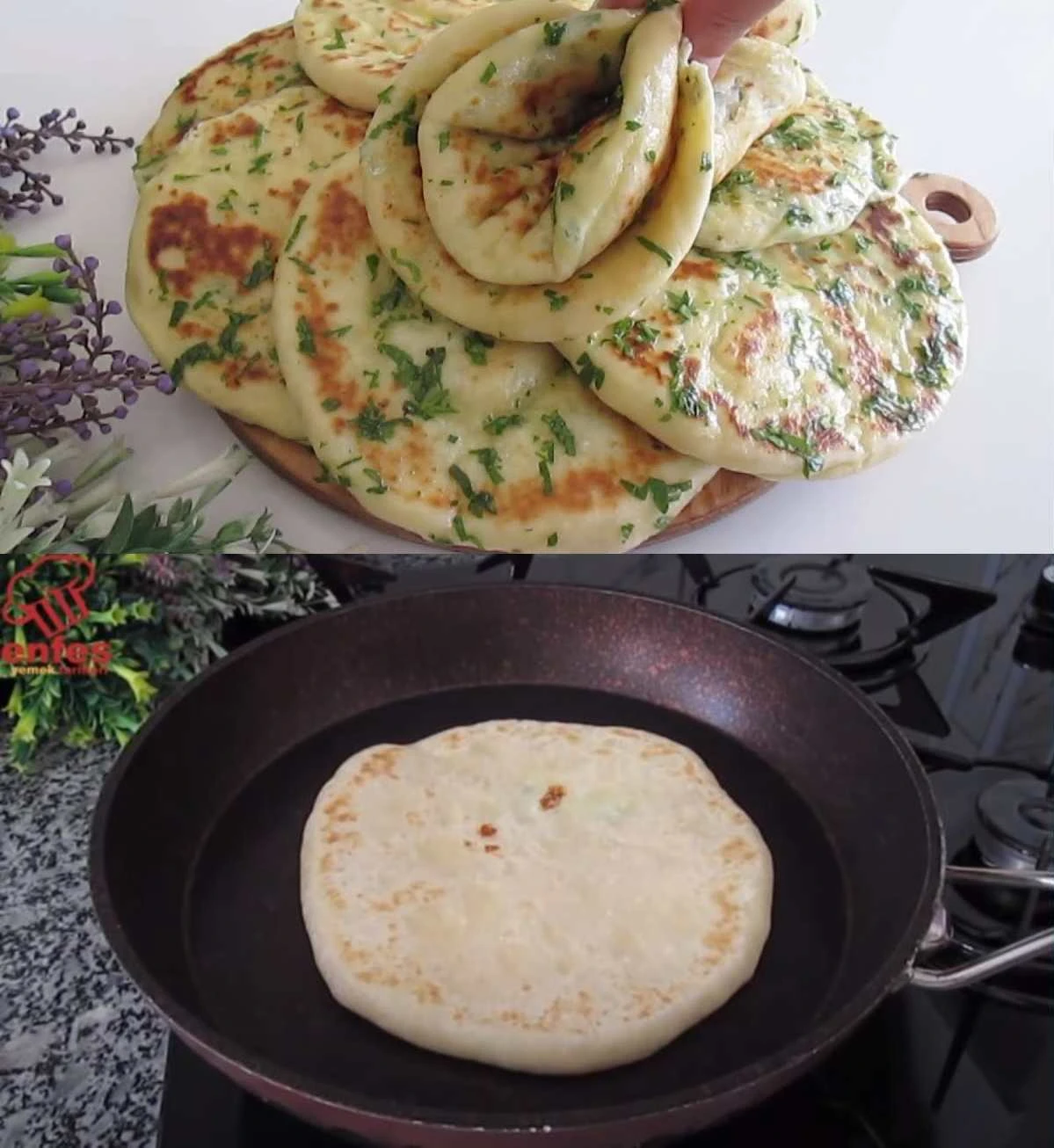 • Backen: Die Fladen in einer heißen trockenen Pfanne von beiden Seiten goldbraun braten.