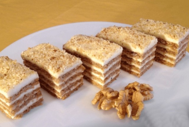 - 4. Zusammensetzen der Schnitten: Den abgekühlten Teig in Hälften teilen, so erhalten Sie 4 Teigplatten. Bestreichen Sie jede Platte mit der vorbereiteten Creme, schichten Sie sie übereinander und schließen Sie mit einer Cremeschicht ab. Mit gemahlenen Nüssen bestreuen.