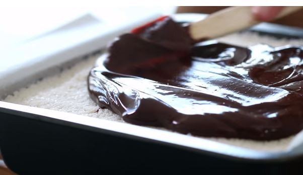- Fertigstellung des Kuchens: Gießen Sie die Glasur über die Kokosschicht und lassen Sie den Kuchen mindestens eine Stunde im Kühlschrank fest werden.