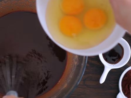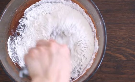 - Hinzufügen weiterer trockener Zutaten: Fügen Sie Vanillearoma, halbgriffiges Mehl, Salz und Kakao hinzu. Rühren Sie gut, bis der Teig glatt und klumpenfrei ist.
