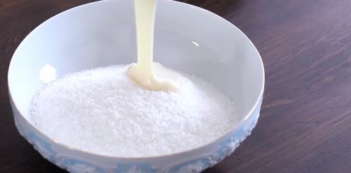- Zubereitung der Kokosschicht: Vermischen Sie Kondensmilch und Kokosraspel in einer Schüssel. Rühren Sie, bis eine homogene Mischung entsteht.