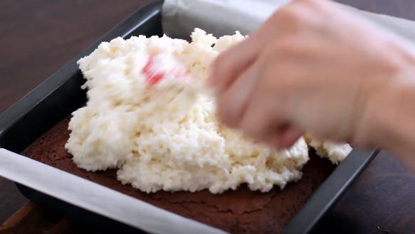 - Zusammenstellen des Kuchens: Streichen Sie die Kokosmischung gleichmäßig auf den abgekühlten Teig.