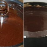 - Zubereitung der Schokoladenglasur: In einem Topf bei schwacher Hitze Schokolade mit Butter und Sahne schmelzen. Rühren, bis die Masse glatt ist, und bei Raumtemperatur abkühlen lassen.