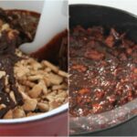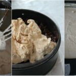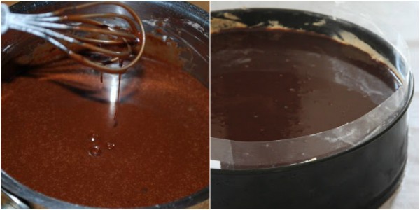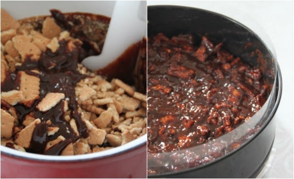 - Zubereitung des Bodens: In einem Topf Kondensmilch mit Sahne mischen und bei schwacher Hitze erhitzen. Die Schokolade hinzufügen und rühren, bis sie schmilzt und eine glatte Masse entsteht. Sobald die Mischung leicht zu köcheln beginnt, vom Herd nehmen und die Butterkekse hineinbrechen. Gut umrühren, damit alle Kekse mit der Schokoladenmischung bedeckt sind. Eine runde Springform bereitlegen und die Keksmasse auf den Boden drücken. Die Oberfläche mit einem Löffel glattstreichen.