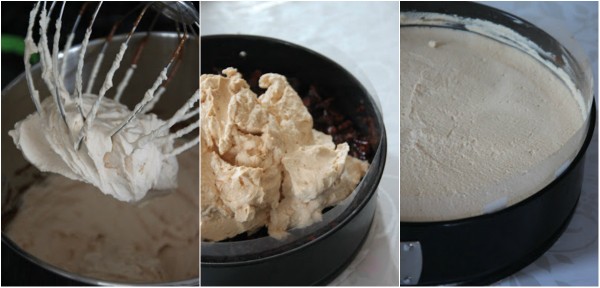- Zubereitung der Füllung (Mousse): In einem Topf Sahne mit Vanillepuddingpulver mischen und nach Packungsanweisung einen klassischen Pudding zubereiten. Wenn der Pudding fertig ist, die Kondensmilch hinzufügen und gut verrühren. Die Puddingmasse auf die Keksschicht in der Springform gießen und die Oberfläche erneut glattstreichen. Die Form für eine Stunde in den Gefrierschrank stellen.