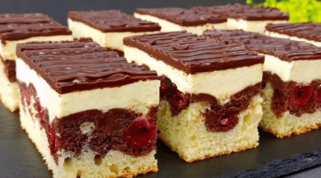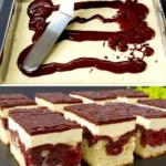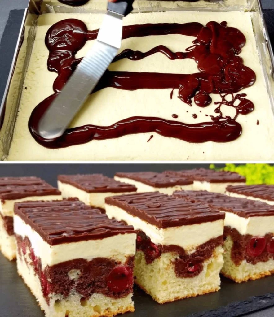 • Zubereitung des Teigs: Butter mit dem Zucker schaumig rühren. Nach und nach die Eier zugeben, dann das mit Backpulver vermischte Mehl und die Milch. Den Teig halbieren – in eine Hälfte Kakao einrühren. Den hellen Teig auf ein mit Backpapier ausgelegtes Backblech streichen, darauf den kakaofarbenen Teig verteilen. Oben gleichmäßig Kirschen oder Sauerkirschen verteilen. Im vorgeheizten Ofen bei 180 °C etwa 25–30 Minuten backen. Vollständig auskühlen lassen.