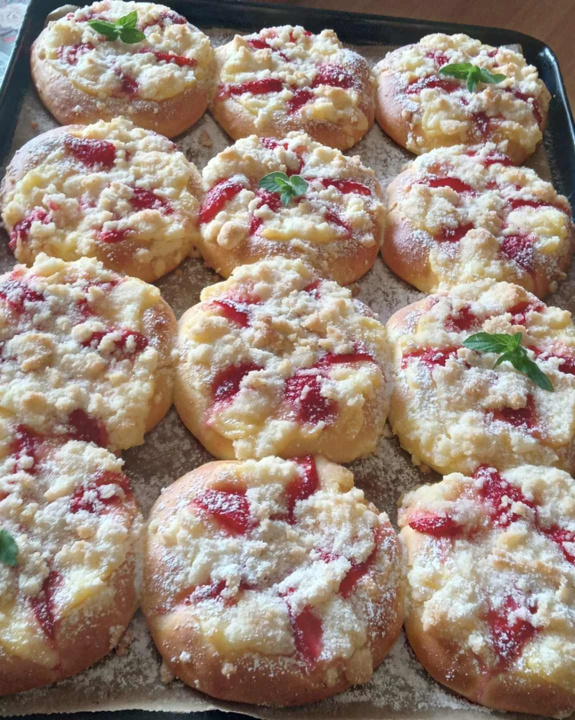 Diese hausgemachten Küchlein mit Pudding, Erdbeeren und Streuseln sind eine Kombination aus luftigem Teig, feiner Creme und saftigem Obst. Sie sind ideal zum Kaffee, für festliche Tische oder einfach, wenn Sie Lust auf einen ehrlichen Nachtisch haben. Frisch serviert kommen sie am besten zur Geltung, schmecken aber auch am zweiten Tag hervorragend. Wenn Sie traditionelles Hausgebäck mit modernem Touch mögen, lohnt es sich definitiv, dieses Rezept auszuprobieren.