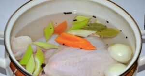 Ich seihe die Brühe ab und zupfe das Fleisch. In Schmalz brate ich die Zwiebel an, füge Tomatenmark, grob geschnittenes Wurzelgemüse