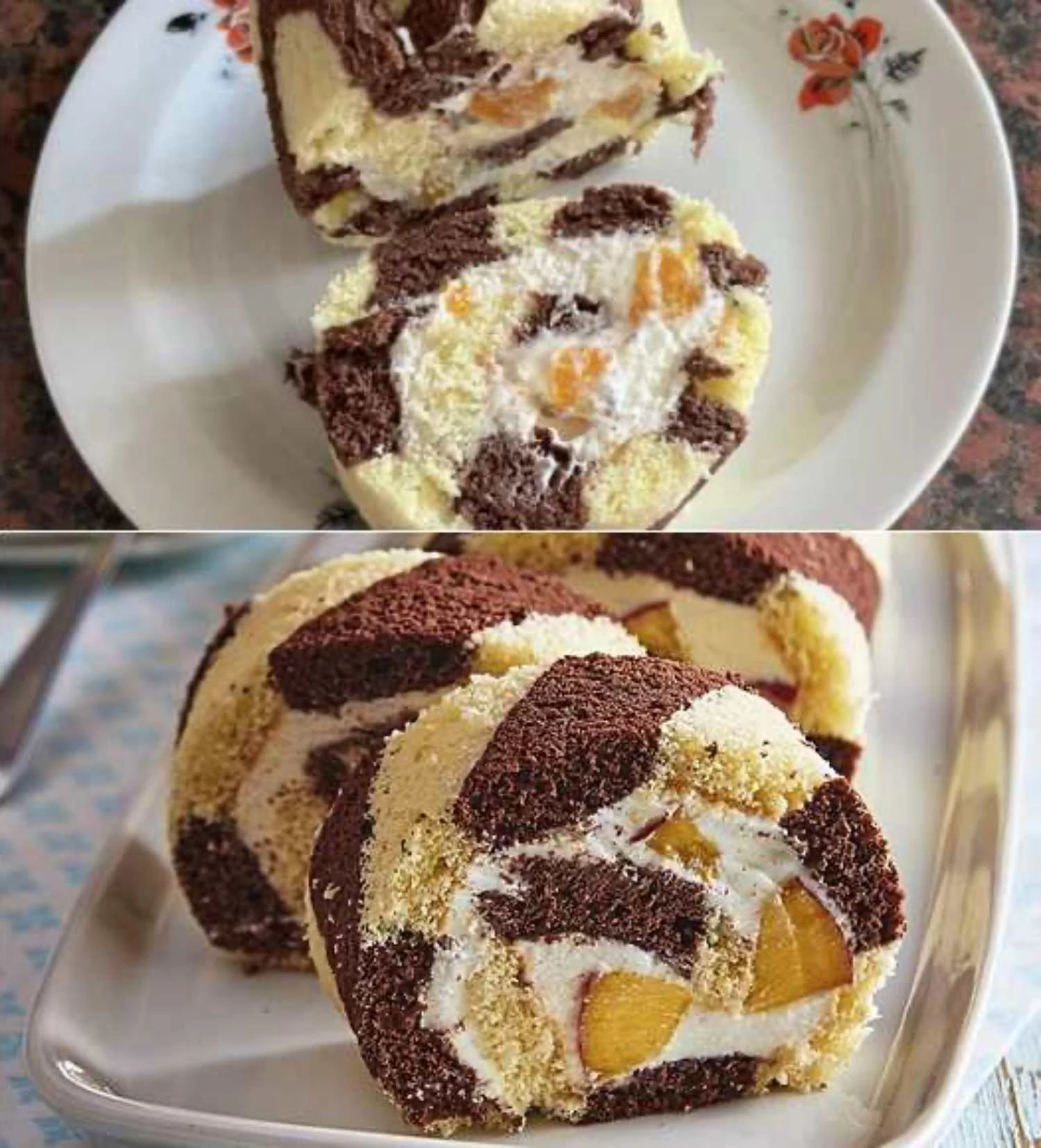 Diese Sahneroulade ist die Essenz einfacher Konditorei. Fluffiger Biskuit, feste und leichte Sahne sowie saftiges Obst ergeben zusammen ein Dessert, das zu jeder Feier und zum gewöhnlichen Sonntagskaffee passt. Die Basis lässt sich leicht je nach Saison mit anderem Obst variieren und die Dekoration auf der Platte hebt das Aussehen um eine Klasse.
