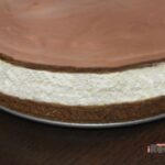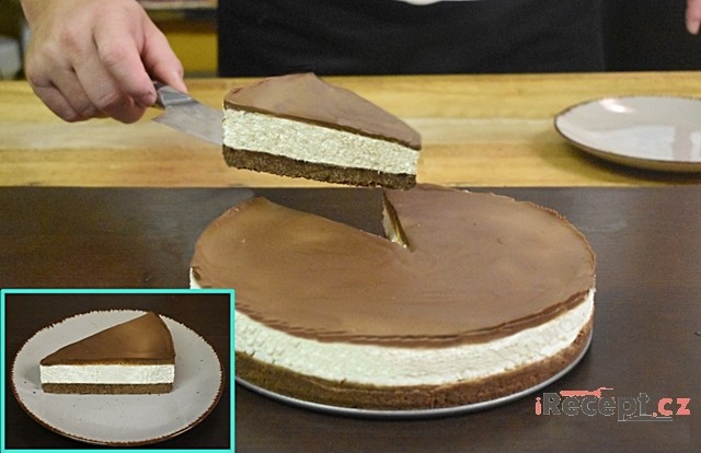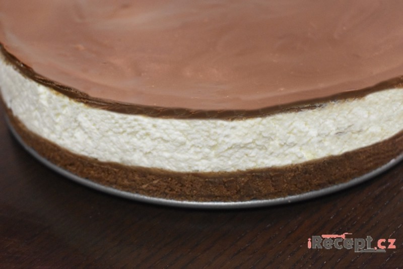 Wir nehmen den Tortengrund aus dem Kühlschrank und geben mit einer Kelle vorsichtig die noch heiße Schokolade darüber. In den Kühlschrank stellen, wo die so zubereiteten Míša-Schnitten 2-3 Stunden auskühlen sollen