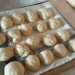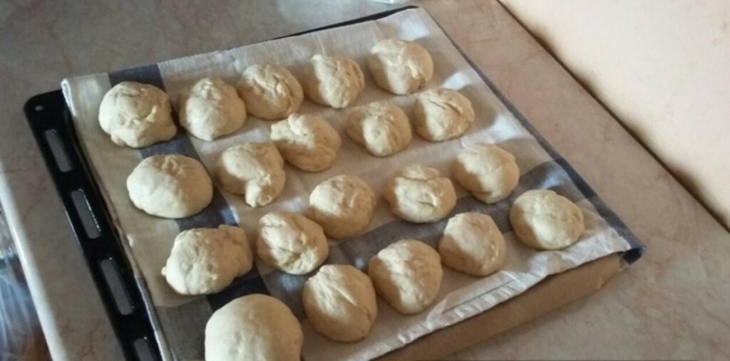 - Wenn der Teig aufgegangen ist, beginnen wir, einzelne Stücke abzureißen, kleinere Stücke, und formen sie in den Händen zu Kugeln, wie man auf dem Bild sieht.
