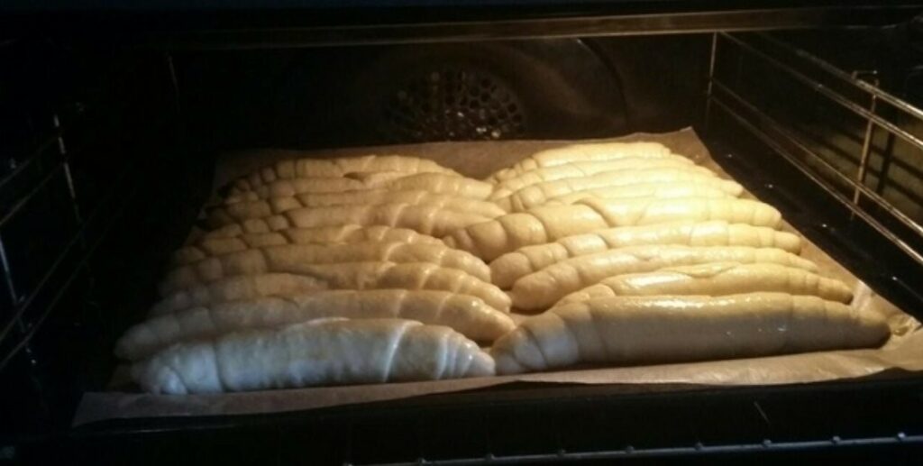 - Die Hörnchen können wir noch mit Öl oder mit verquirltem Ei bestreichen.