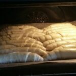 - Dann bestreichen wir auch das Papier, oben, wo wir die Hörnchen ablegen werden, leicht mit Öl, aber sehr sparsam.