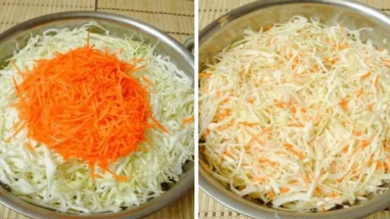 • Vorbereitung des Kohls und des Gemüses: Entfernen Sie von den Kohlköpfen die äußeren Blätter und den Strunk. Den Kohl fein schneiden oder raspeln. Die Möhre schälen und grob raspeln. Kohl und Möhre vermischen.
