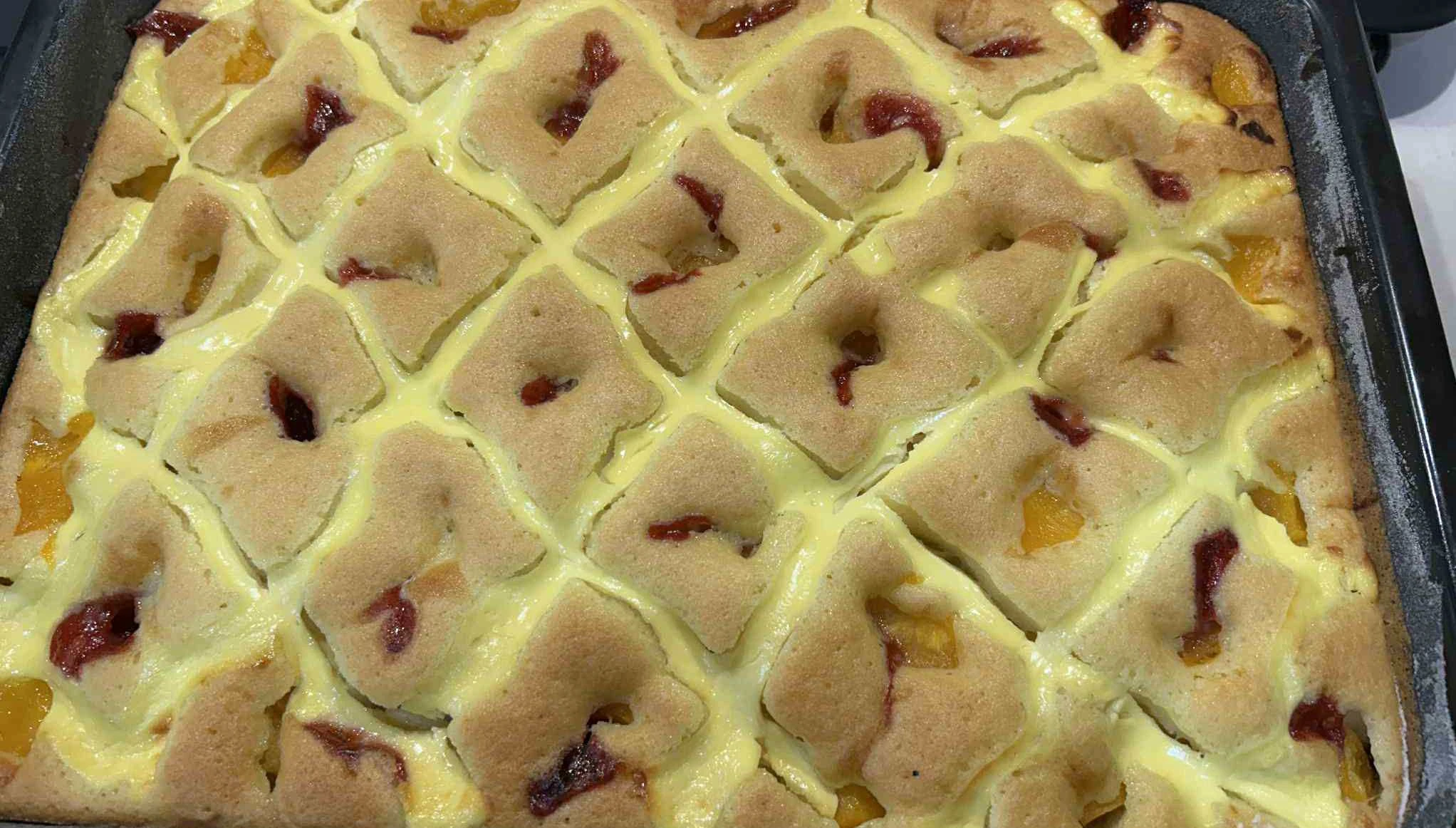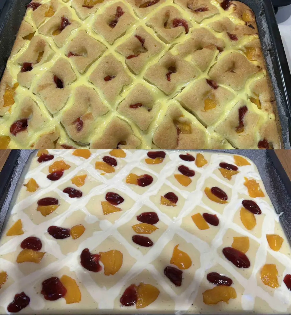 Der eingesunkene Effekt ist beabsichtigt: Quark, Obst und Marmelade bilden „Inseln“, die den Teig stellenweise zusammenziehen – dadurch wird der Kuchen besonders saftig.