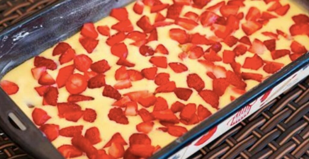 - Auf den Teig legen wir halbierte Erdbeeren.