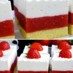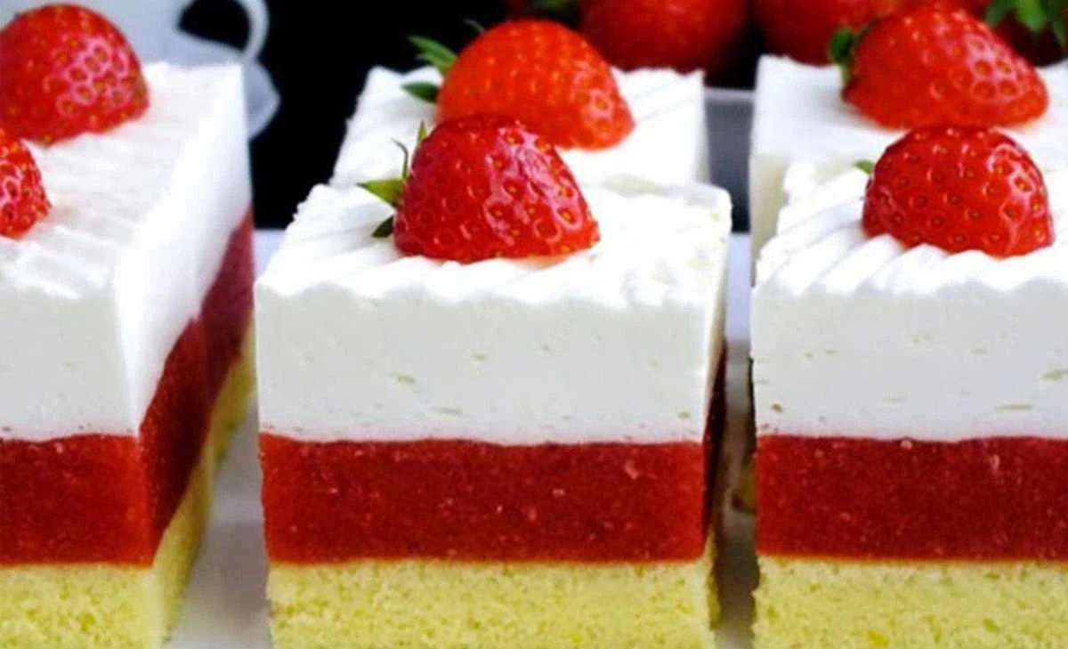 Sommerklassiker, der nie enttäuscht. Ein zarter Biskuitboden, eine intensive Erdbeerschicht mit Gelatine und obenauf luftige, mit Gelatine stabilisierte Sahne, damit sie schön in Form bleibt. Die Schnitten sind frisch, leicht und sehen auf dem Teller perfekt aus – ideal für Familienfeiern und als Sonntagsdessert.
