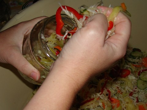 - Die Gemüsemischung dann bis zum Rand in sterilisierte Einmachgläser drücken, in jedes Glas den Gemüsesaft nachfüllen und die Gläser gut verschließen.