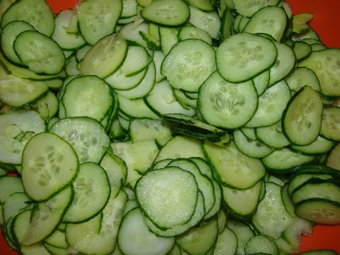 - Die Gurken waschen und in dünne Scheiben schneiden.