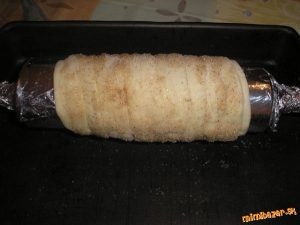 11. Nun setzen wir den Trdelník mit dem Roller auf ein tieferes Backblech. Der Teig darf das Blech nicht berühren und dabei hilft der Roller hervorragend.
