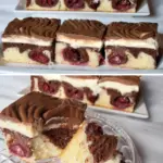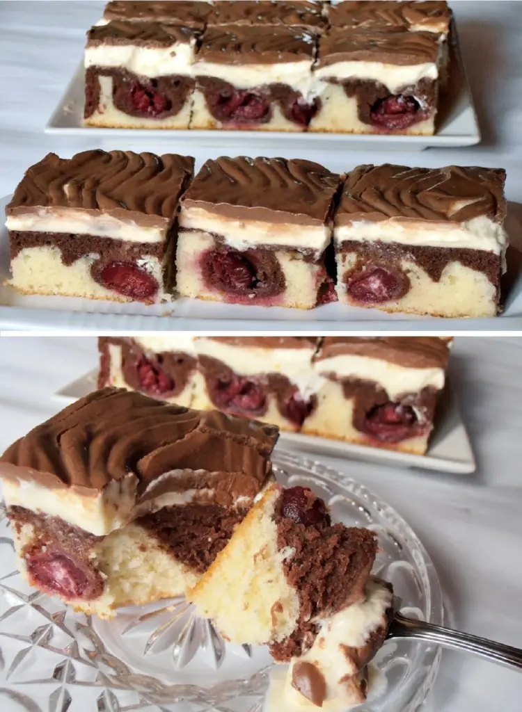 Die festlichen Kirschschnitten mit Creme erfreuen nicht nur Obstliebhaber, sondern auch Fans cremiger Desserts. Die Kombination aus marmoriertem Teig, saftigen Kirschen und zarter Schokoladenganache schafft auf dem Tisch ein echtes Schmuckstück. Die Schnitten kalt servieren und im Kühlschrank aufbewahren, damit sie ihre perfekte Struktur behalten.