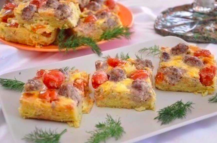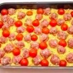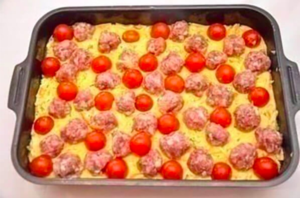 - Auf die Kartoffeln legen wir die Fleischbällchen. Zum Schluss füllen Sie die Zwischenräume zwischen den Bällchen mit Cherrytomaten.