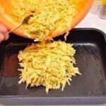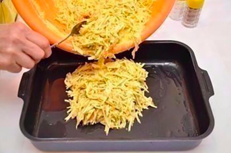- Fetten Sie das Blech mit Öl ein. Den Boden der Auflaufform bedecken wir mit der Kartoffelmischung. Glätten Sie.