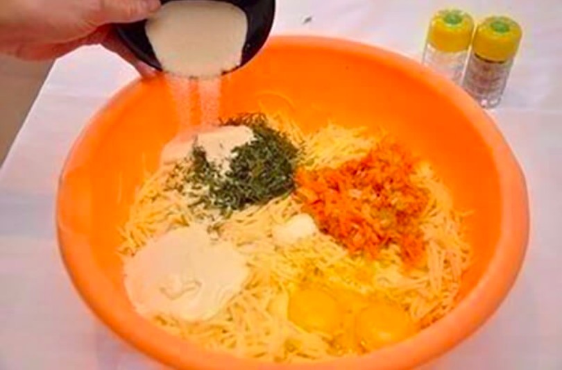 - Anschließend mischen wir Mayonnaise, Senf, Möhre, Eier, Grieß und würzen mit Salz, Kurkuma und Pfeffer. Jetzt mischen wir alles, außer dem Fleisch natürlich, mit den geriebenen Kartoffeln. Gut durchmischen.