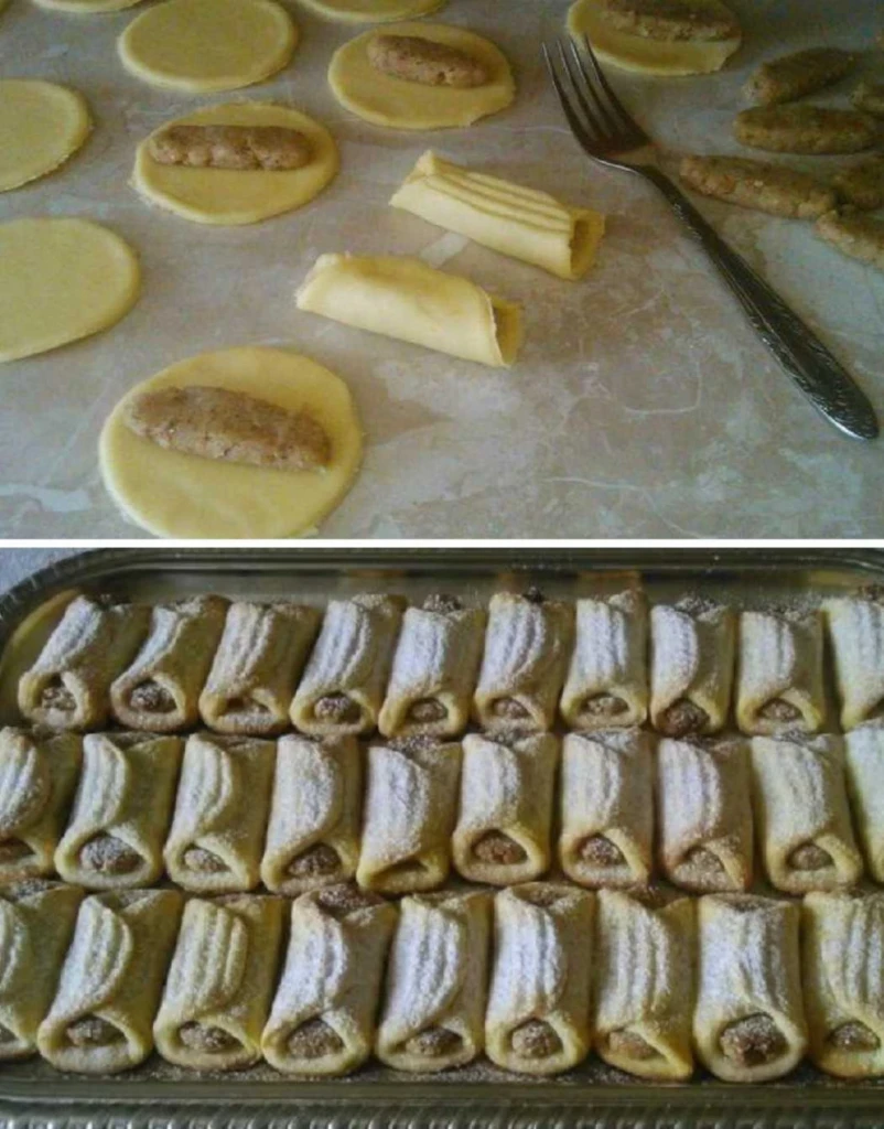 • Pečení Backen Die Rollen auf ein mit Backpapier ausgelegtes Backblech legen. Mit der Zuckerlösung bestreichen (Zucker in Wasser gelöst) und im vorgeheizten Ofen bei 200 °C goldbraun backen – etwa 12–15 Minuten. Nach dem Abkühlen können sie leicht mit Puderzucker bestreut werden.