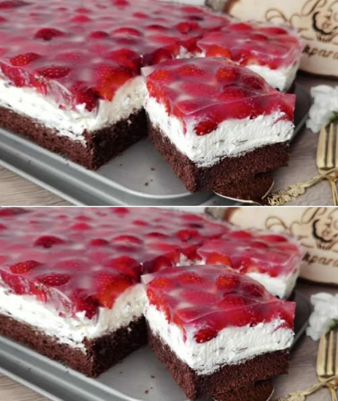 Dieser frische Erdbeerkuchen ist die perfekte Kombination aus saftigem Kakaoboden, zarter Mascarpone-Creme und saftigen Erdbeeren. Dank der einfachen Zubereitung und des beeindruckenden Aussehens wird er zum Star jeder Feier oder eines sommerlichen Beisammenseins. Wenn Sie ein Dessert suchen, das Geschmack und Leichtigkeit verbindet, haben Sie es gerade gefunden.