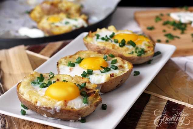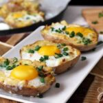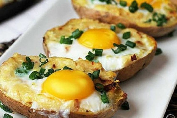 Gebackene Kartoffeln, gefüllt mit einer Mischung aus Käse, Knoblauch und Zwiebeln, mit einem Ei obenauf
