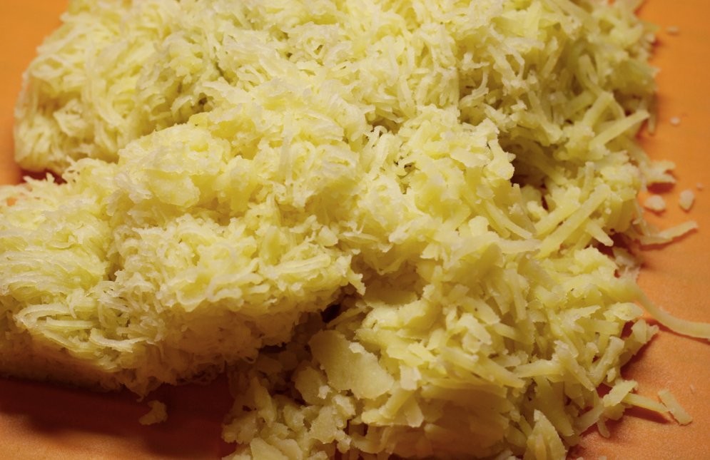 • Wir schälen die Kartoffeln und reiben sie fein. Wir drücken den Großteil der Stärke aus und fügen Sauerkraut hinzu – es ist gut, es in kleinere Stücke zu schneiden.