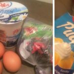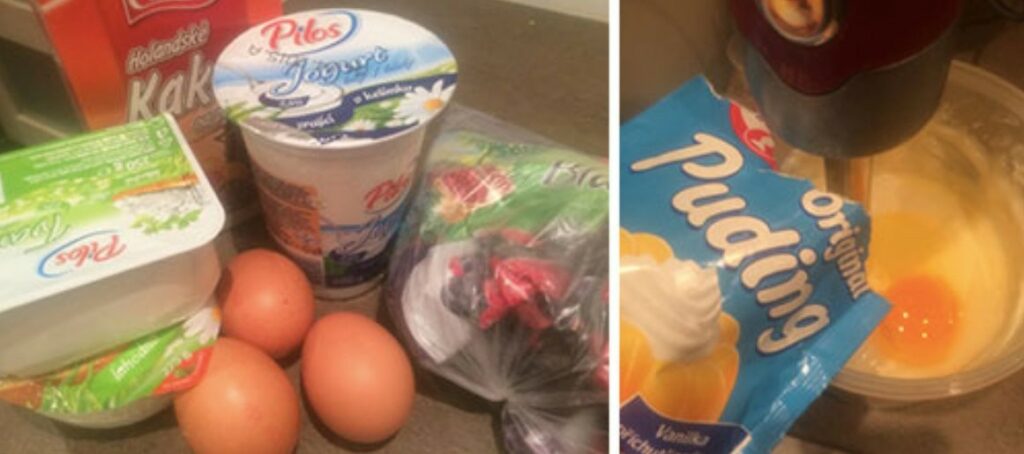 - Wir bereiten die Zutaten vor. Den glatten und den körnigen Quark mixen wir mit einem Stabmixer, fügen 4 Esslöffel Naturjoghurt und das Vanillepuddingpulver hinzu.