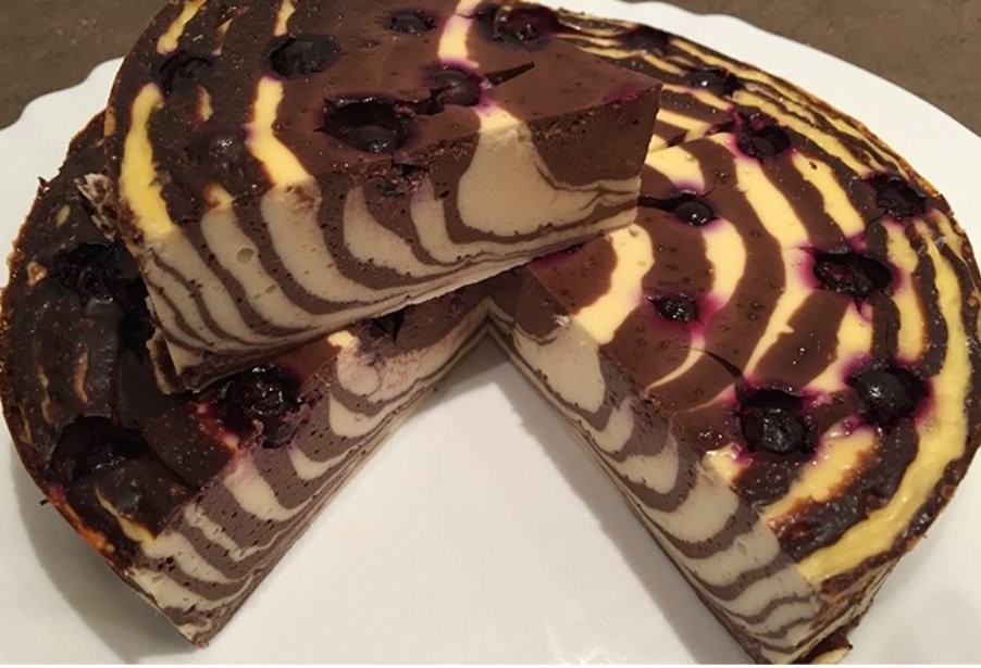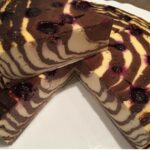 - Wir beginnen, die Teige zu schichten. Die Teige schichten wir abwechselnd zur Mitte der Form. Wir beginnen mit dem hellen und fahren fort, bis beide Teige aufgebraucht sind. Oben legen wir Obst nach Geschmack und geben die Form in den vorgeheizten Ofen.