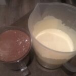 - Die fertige Masse teilen wir in 2 Teile (einen größeren, den anderen kleineren) und in den kleineren geben wir 2 Esslöffel Kakao.