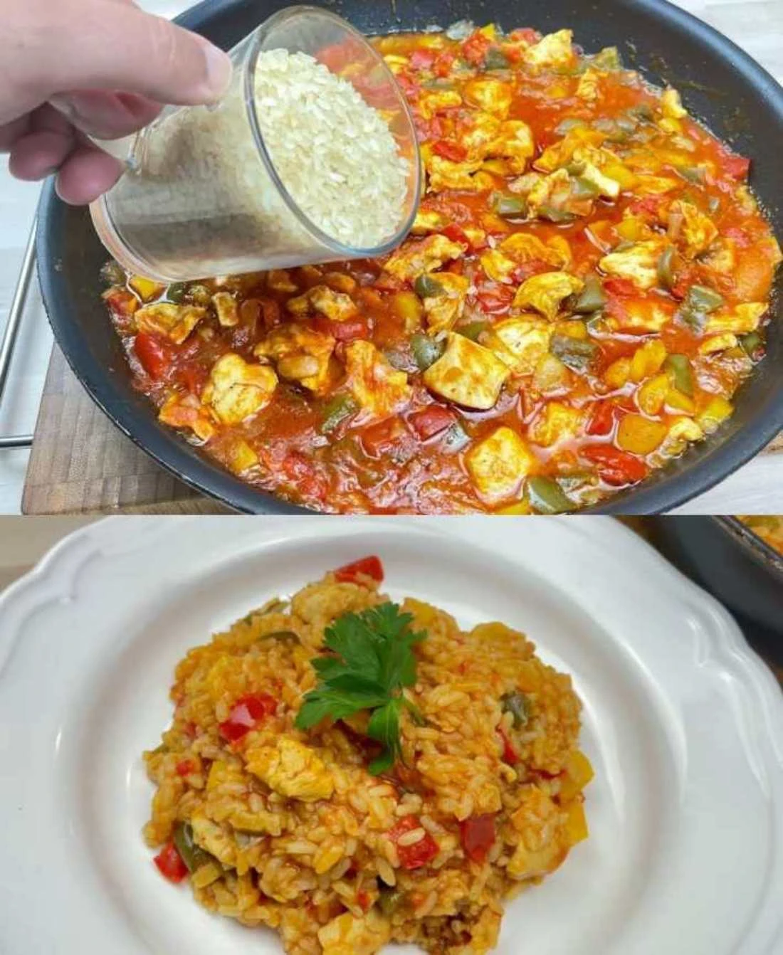 Dieses schnelle Hähnchen mit Reis in einer Pfanne ist ideal, wenn Sie nicht lange am Herd stehen möchten. Dank der bunten Paprika und der Gewürze hat das Gericht einen kräftigen Geschmack und Duft und sättigt die ganze Familie. Ob Sie es zum Mittag- oder Abendessen zubereiten, Sie werden es bestimmt lieben. Weniger Geschirr, mehr Geschmack – genau so soll es in der Küche funktionieren.