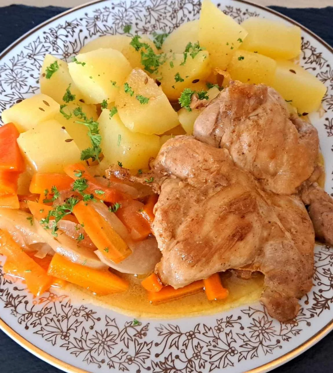 In der Einfachheit liegt die Kraft! Dieses Rezept für ein Hähnchen-Naturschnitzel aus dem Oberschenkel, serviert mit gekochten Kartoffeln und gedünstetem Gemüse (Karotte und Kohlrabi), ist ein Beweis dafür, dass ein hausgemachtes Mittagessen nicht kompliziert sein muss, um außergewöhnlich schmackhaft zu sein. Eine zarte Sauce auf Butterbasis mit einem Schuss Wein und Zitrone verleiht dem Gericht Frische und geschmackliche Tiefe.
