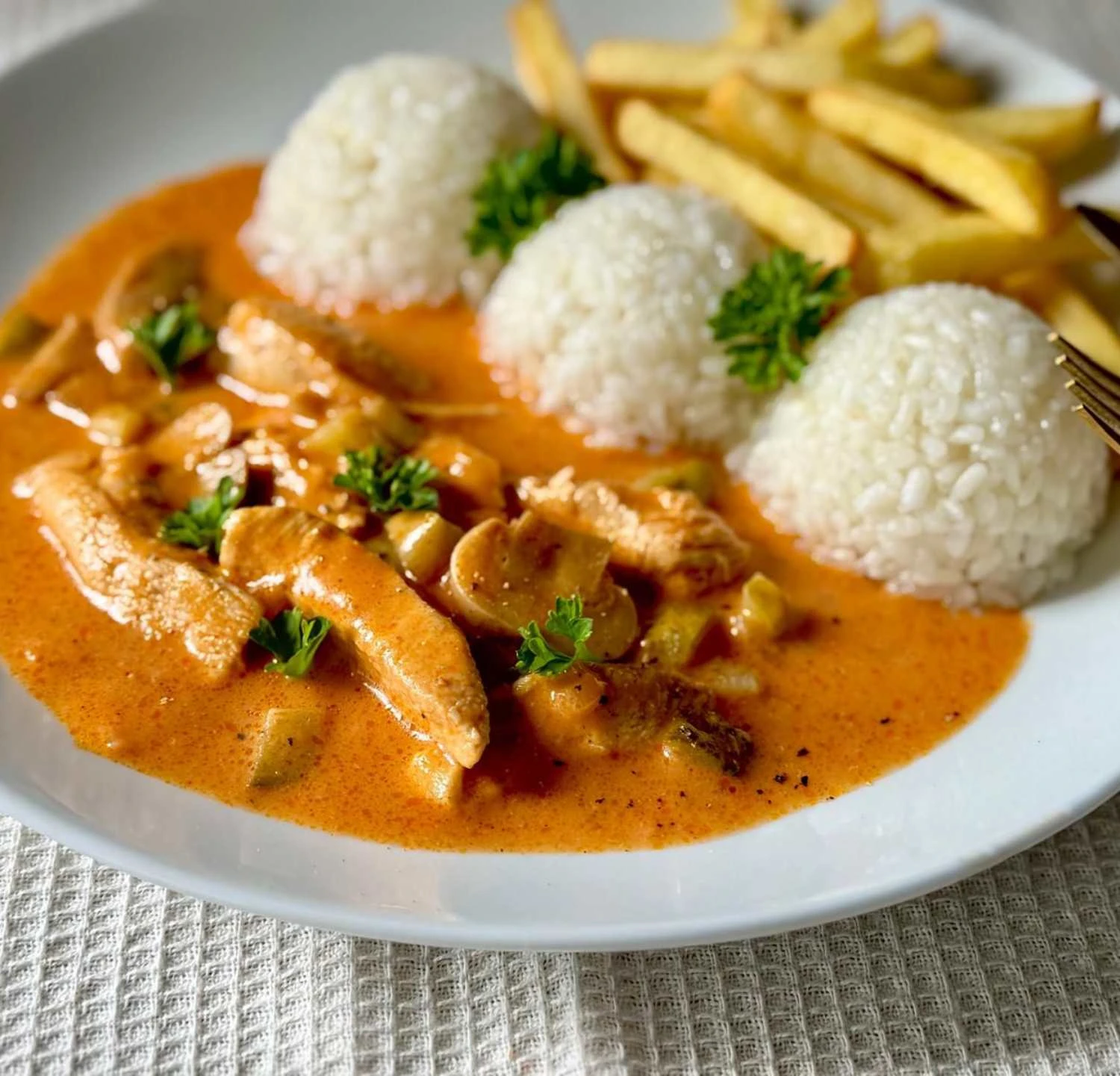 Hähnchenstroganoff ist der Beweis, dass auch ein schnelles Mittagessen außergewöhnlich schmackhaft sein kann. Die Verbindung von zartem Fleisch, kräftiger Worcestersauce und einer sahnig-tomatigen Basis schafft ein Gericht, das die ganze Familie begeistert. Es ist ein universelles Rezept, das sich sowohl für das Alltagskochen als auch für das Wochenendmenü eignet. Wenn Sie ein kräftiges und einfaches Gericht suchen, ist Hähnchenstroganoff eine ausgezeichnete Wahl.