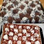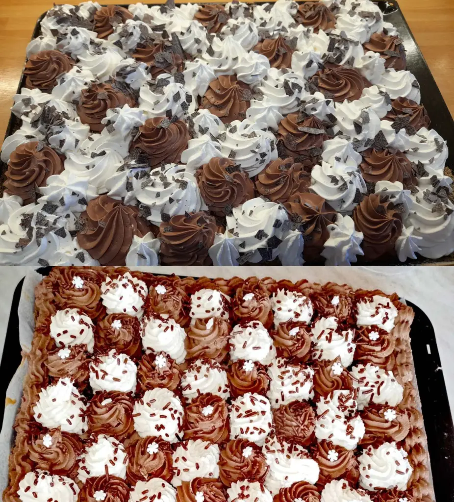 Harlekin auf dem Blech ist ein elegantes und zugleich einfaches Dessert, das sowohl Schokoladenliebhaber als auch Fans leichter Sahnekuchen zufriedenstellt. Der luftige Boden und die zweifarbige Schlagsahne erzeugen einen perfekten Kontrast von Geschmack und Textur, daher passt es sowohl zum Kaffee als auch zu Familienfeiern. Speichern Sie das Rezept unter Bewährtes – bereiten Sie einfach die dunkle Schlagsahne am Vortag zu und Sie sind fast fertig.