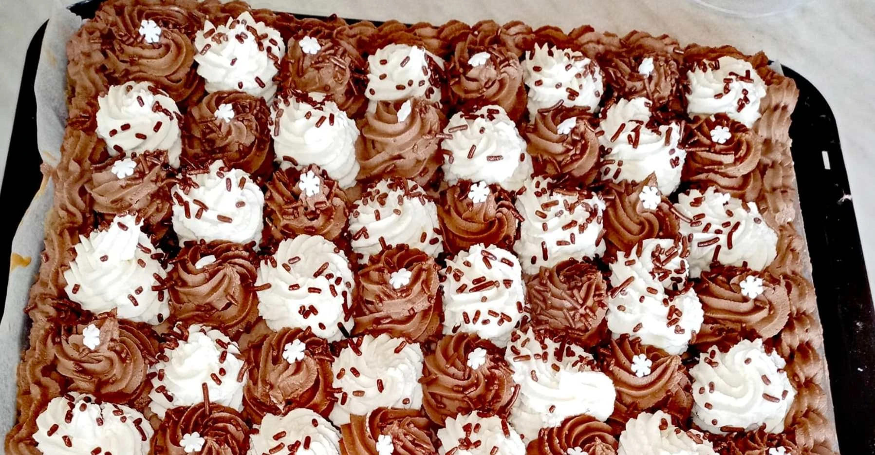 Harlekin auf dem Blech ist ein elegantes und zugleich einfaches Dessert, das sowohl Schokoladenliebhaber als auch Fans leichter Sahnekuchen zufriedenstellt. Der luftige Boden und die zweifarbige Schlagsahne erzeugen einen perfekten Kontrast von Geschmack und Textur, daher passt es sowohl zum Kaffee als auch zu Familienfeiern. Speichern Sie das Rezept unter Bewährtes – bereiten Sie einfach die dunkle Schlagsahne am Vortag zu und Sie sind fast fertig.
