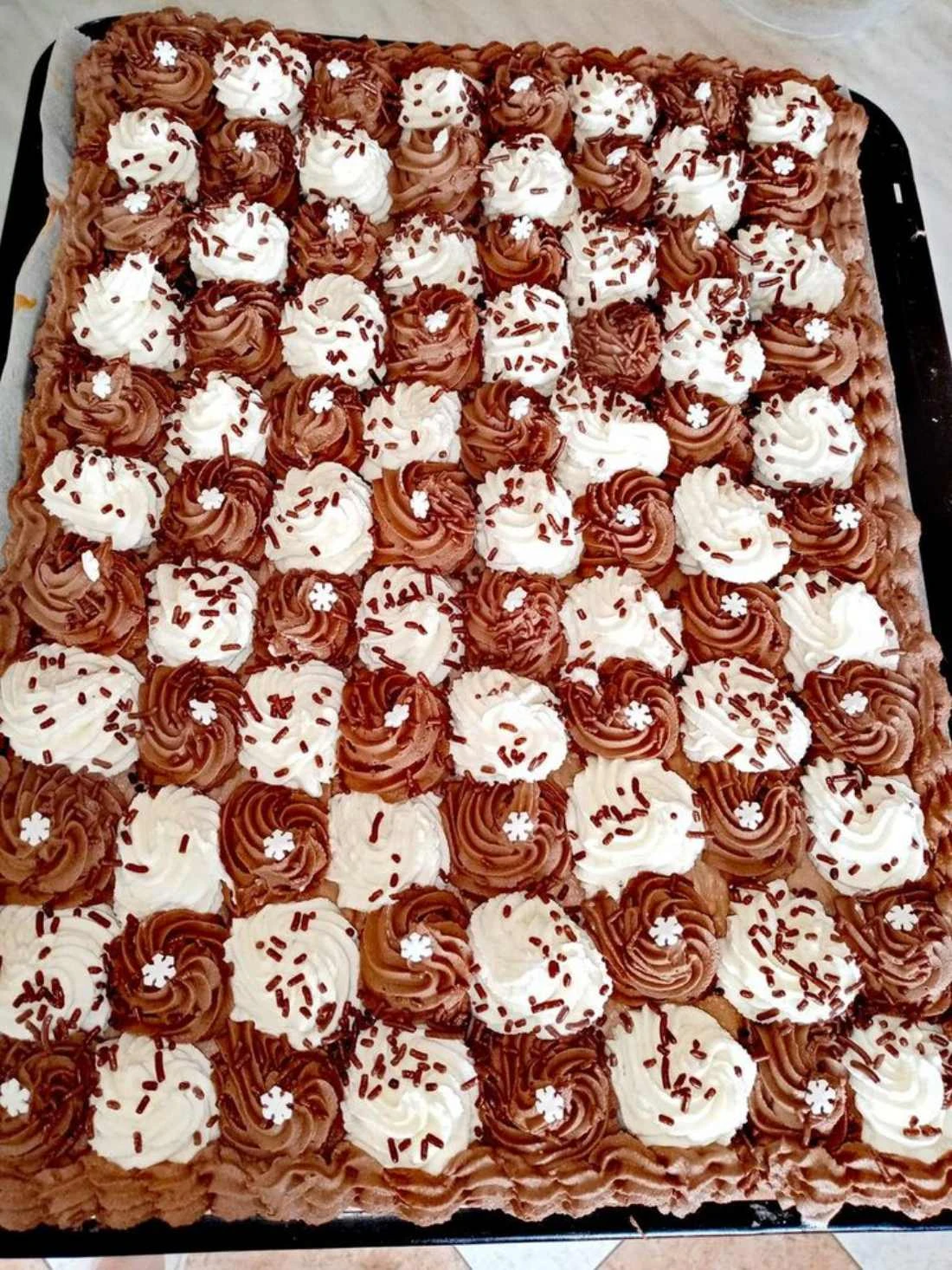• Sestavení dezertu (10 min) a) Vychladlý korpus nechte na plechu a rovnoměrně na něj rozetřete nutelový krém. b) Podle chuti ozdobte pařížskou i světlou šlehačkou. Nakonec lehce poprašte moučkovým cukrem.