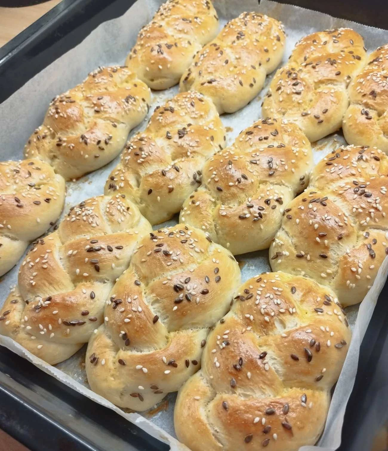 • Brötchen formen Den aufgegangenen Teig in 10–12 Portionen teilen. Aus jeder eine Strähne rollen und zu klassischen geflochtenen Brötchen oder runden Brötchen formen. Auf ein mit Backpapier belegtes Blech legen.