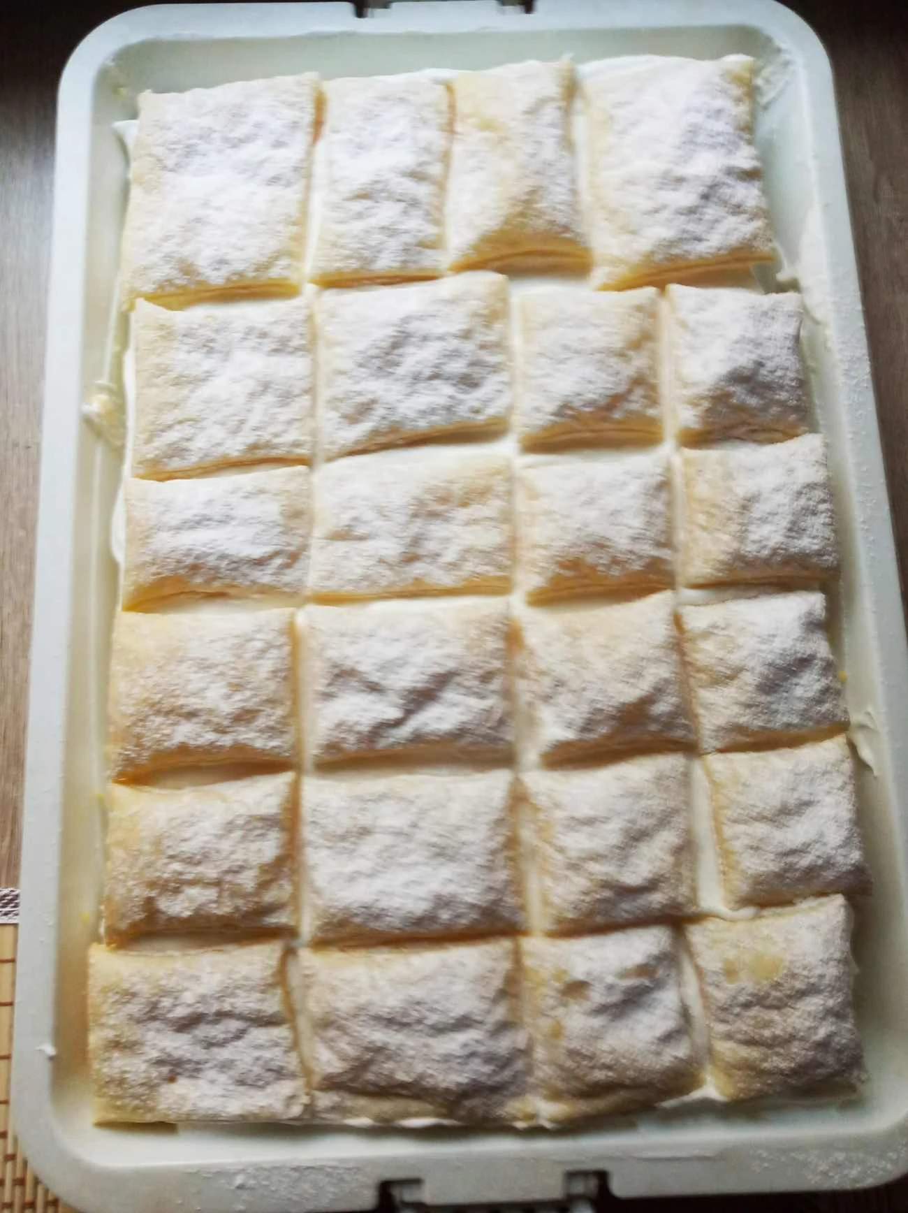 • Zusammenbau des Kremes Auf die erste (nicht zugeschnittene) Platte, leicht mit Puderzucker bestäubt, die abgekühlte Puddingcreme verstreichen und glätten. Darauf eine Schicht Schlagsahne auftragen. Die gebackenen Würfel der zweiten Platte so auflegen, dass die einzelnen Schnitten gut ihre Form halten. Die gesamte Oberfläche leicht mit Puderzucker bestäuben und die Creme sowie die Schlagsahne etwas fest werden lassen (10–15 min).